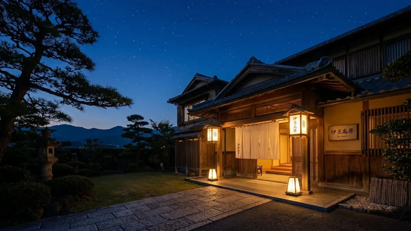 離れの特別室。専用露天風呂から伊豆の山並みと夜空を一望。お二人の記念日や特別な滞在に。